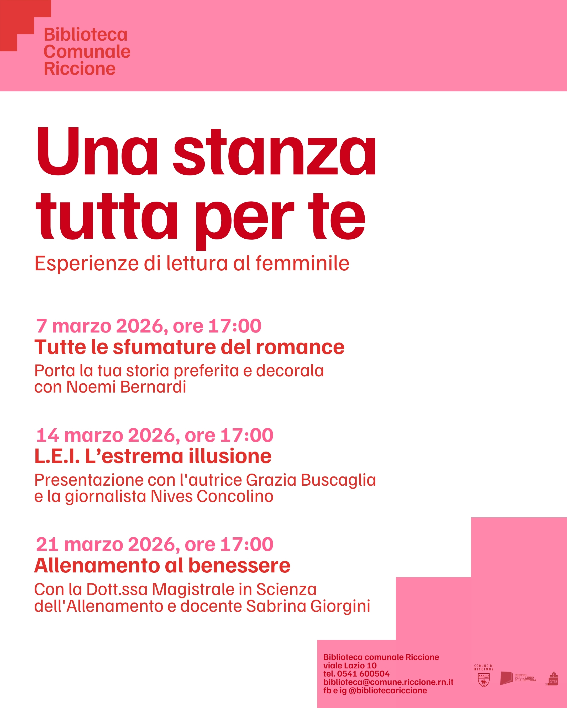 Il ciclo di appuntamenti si conclude sabato 21 marzo con “Allenamento al benessere”, un pomeriggio dedicato alla cura di sé. Sabrina Giorgini, docente universitaria ed esperta in Scienza dell’allenamento, presenterà il libro “Buon viaggio, tesoro. Imparare a volersi bene”, stimolando una riflessione sul benessere come pratica quotidiana, fondamentale per l’equilibrio fisico ed emotivo.